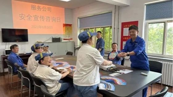 1.服务公司围绕安全生产月主题,组织开展了“安全宣传咨询日”活动。活动现场设置安全生产、咨询服务、安全用电、防中暑安全小常识、安全文化等展示区域,同时滚动播放安全宣传活动视频和逃生演练科普视频集锦,通过多种形式面向职工宣传安全生产红线意识、法律法规及安全常识。此次活动累计发放安全知识宣传册120本,安全文化扇子50把,进一步推动了“安全生产月”活动走深走实,安全理念入脑入心,营造了全员参与安全生产的浓厚氛围。